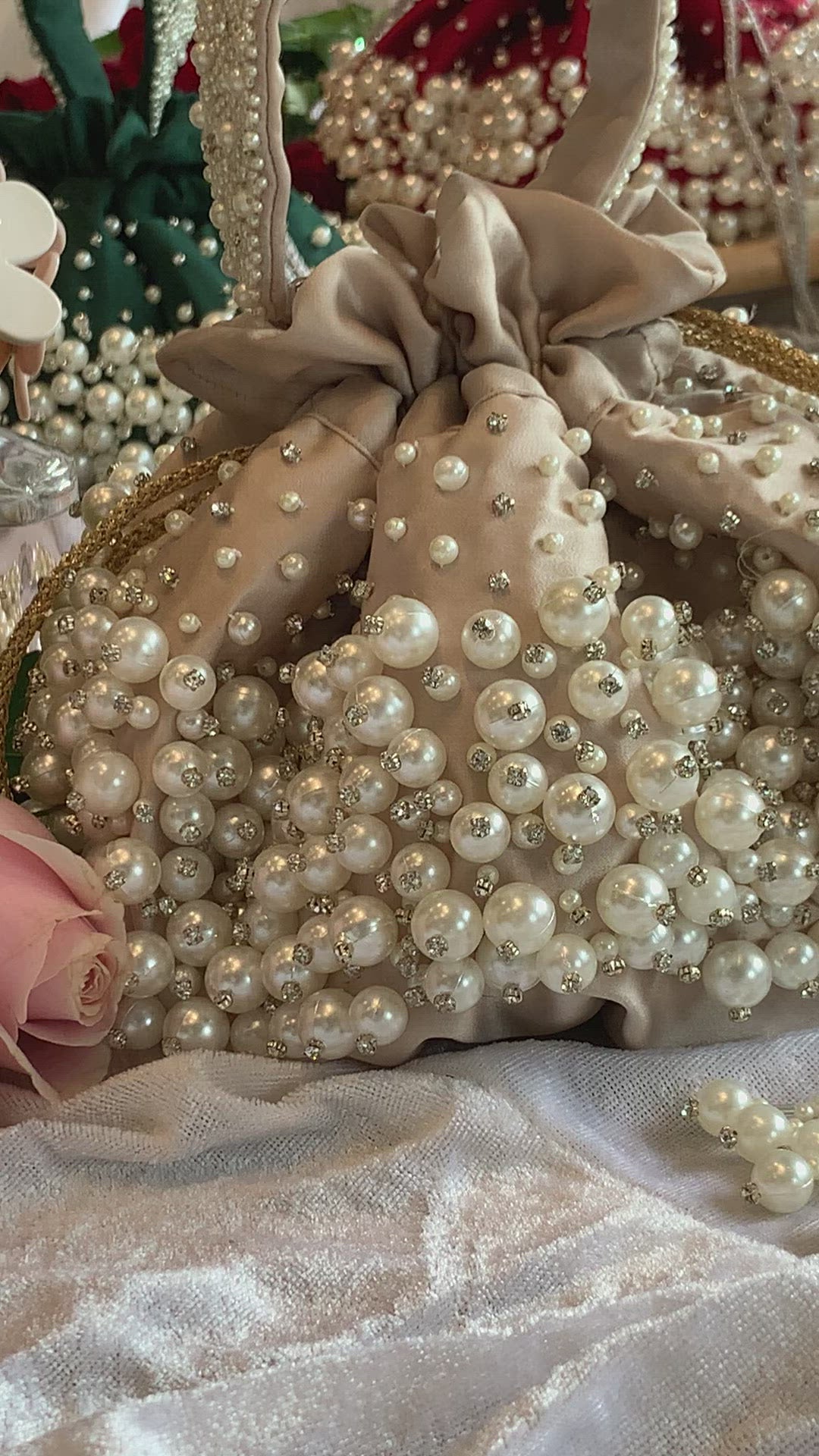 Amor collection is Özel's dream project, full of ruffles, romance and opulence. Bijoux is Özel's bejwelled Potli Bag adorned with pearls and stones all over the bag. It does not get any fancier than this! The bag comes with a gorgeous hand embroidered pearl handle and adorned with elegant pearls tassels.
