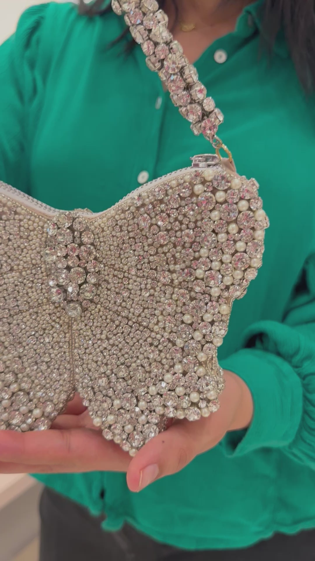 The perfect bow bag! Blinged with silver crystals and pearls this mini bag is all the glam you need to carry to turn some heads. This mini bag cannot fit your phone. It comes with a zip closure.