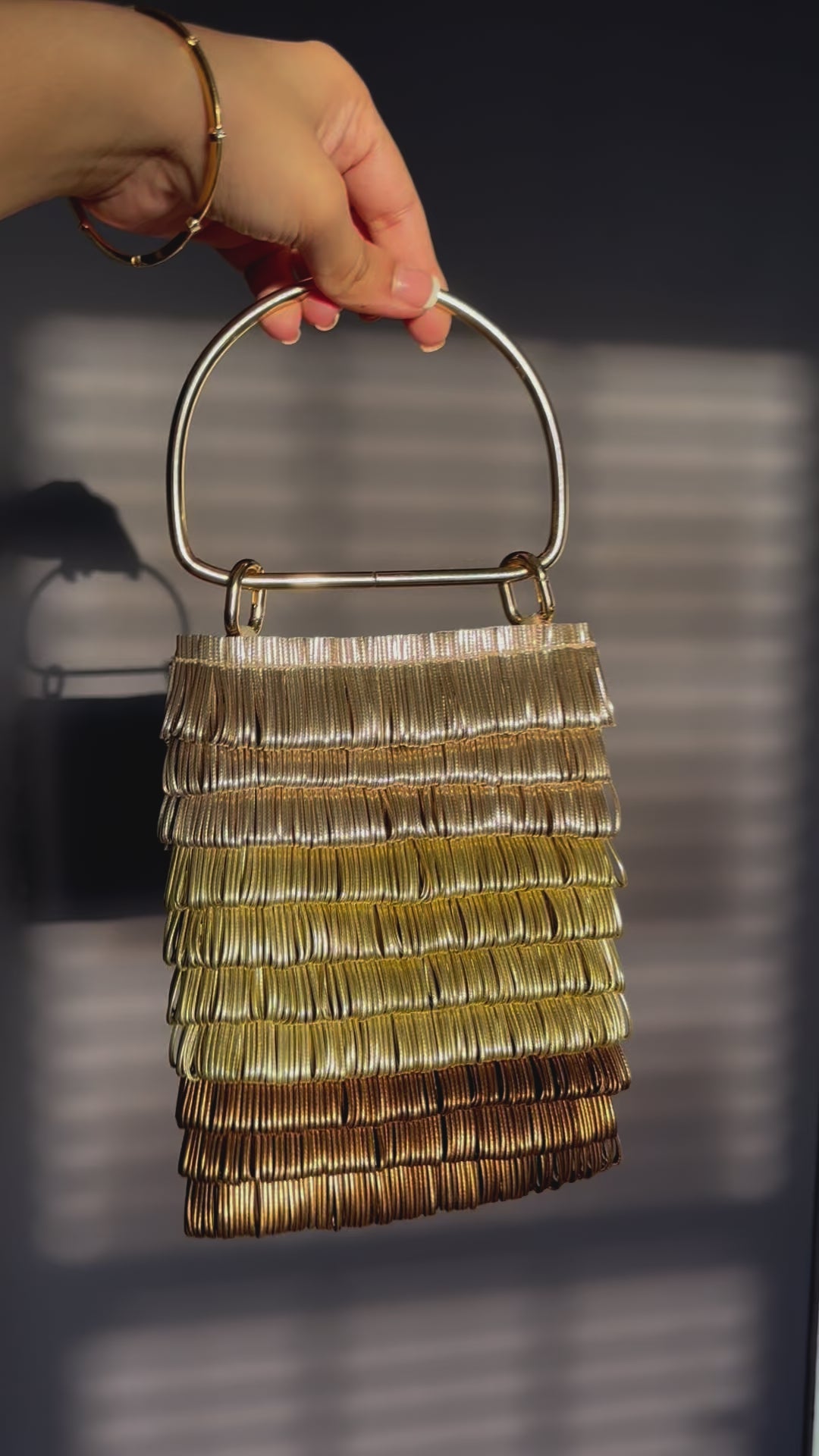 This bag can fit your mobile and other essentials. Made with three tones of metallic cords this bag is sure to turn heads. The highlight is the beautiful gold metal handle.