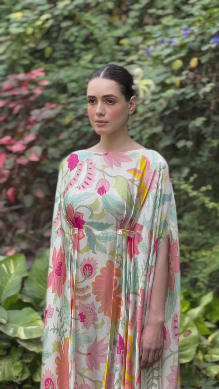 Floral print on silk satin, this kaftan with embroidered brooch cinches at the waist. It drapes and falls beautifully on the body with cowls in front and back. The vibrant floral print makes this kaftan a favorite for festive or occasion wear.