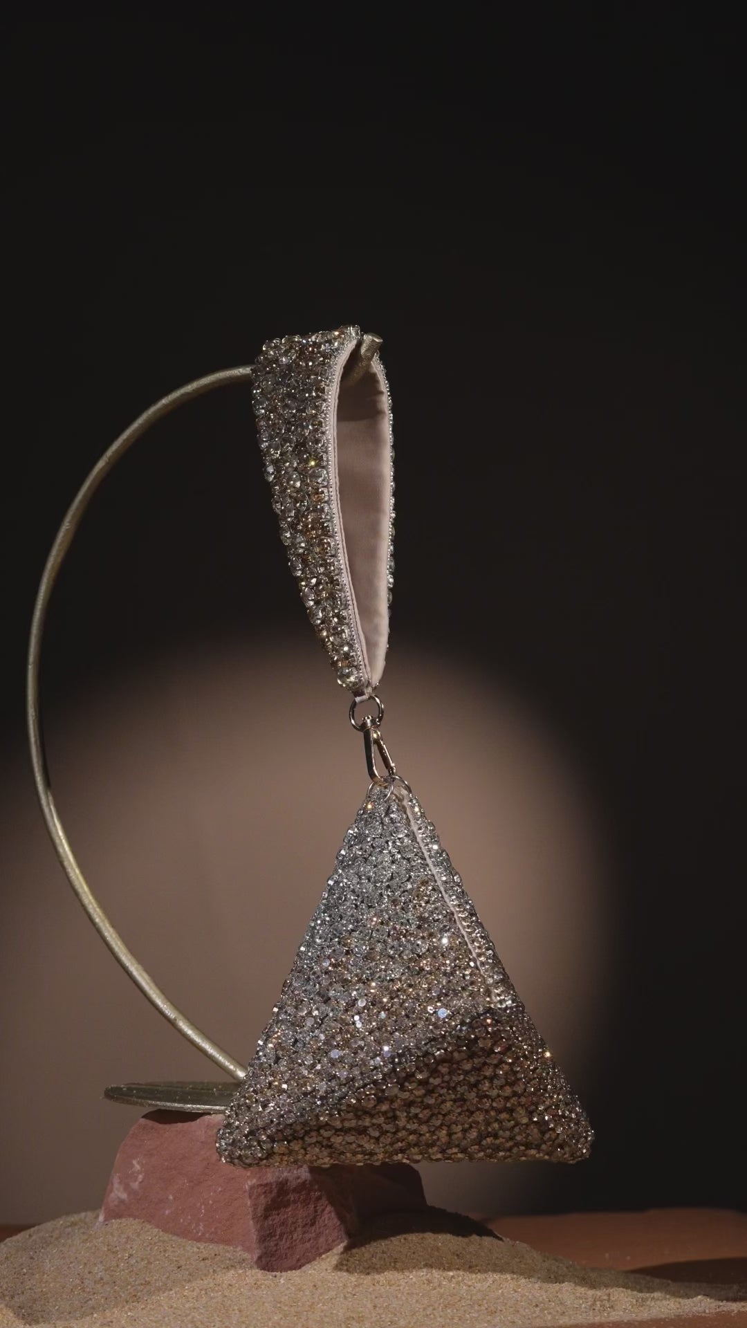 Introducing a great combination of luxury and glamour—the Golden and Silver Rhinestones Pyramid Structured Bag. Prepare to be swept away by the sheer opulence and undeniable sophistication of this exquisite accessory. This pyramid structured bag comes with an embroidered handle to hold it. This bag cannot fit your phone.