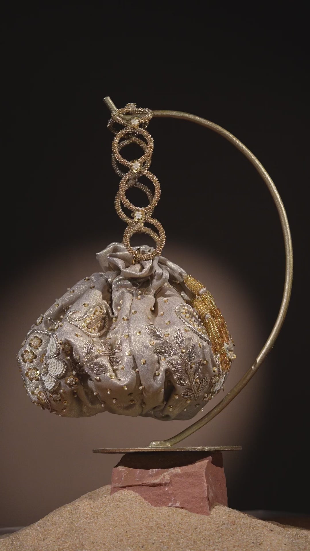 The Gold Zardozi Potli Bag is a luxurious masterpiece, a true testament to the craftsmanship of bygone eras. It's not just a bag; it's a piece of art that transports you to the courts of royalty with its intricate detailing and timeless elegance. This can fit your phone.