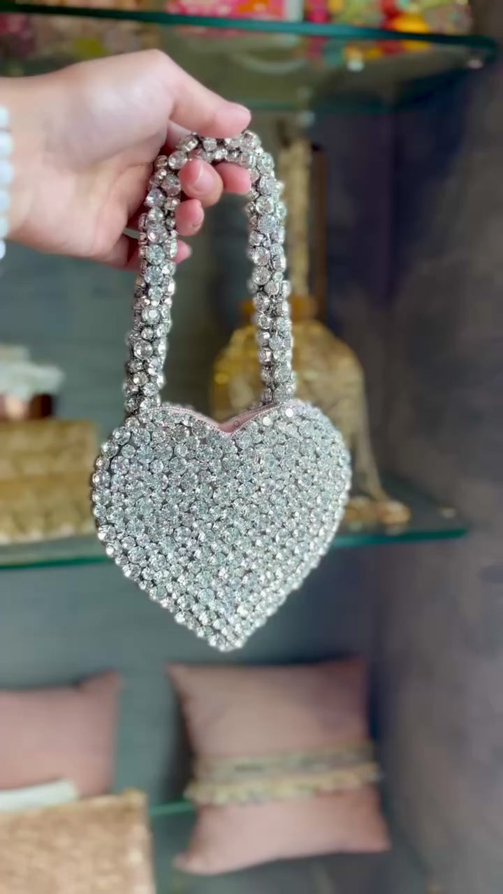 Here to win your hearts with its bejeweled body, we present the Rhinestone Mini Heart Bag. The bag features a chain handle studded with rhinestones.