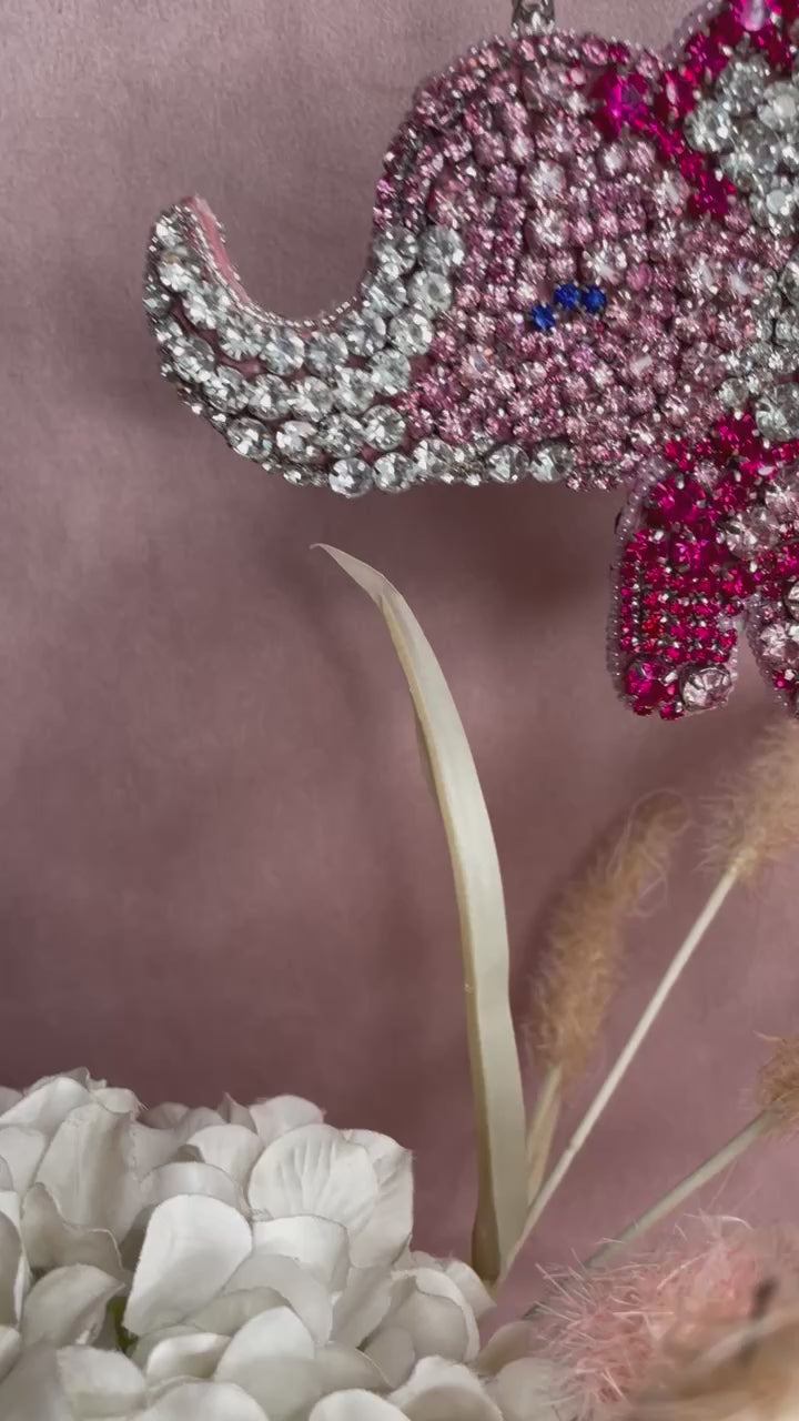 Here to win your hearts with its bejeweled body, we present the Pink & Silver Rhinestone Elephant Bag. The bag features a sling chain.