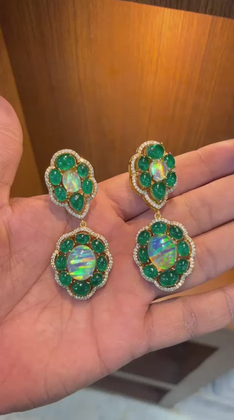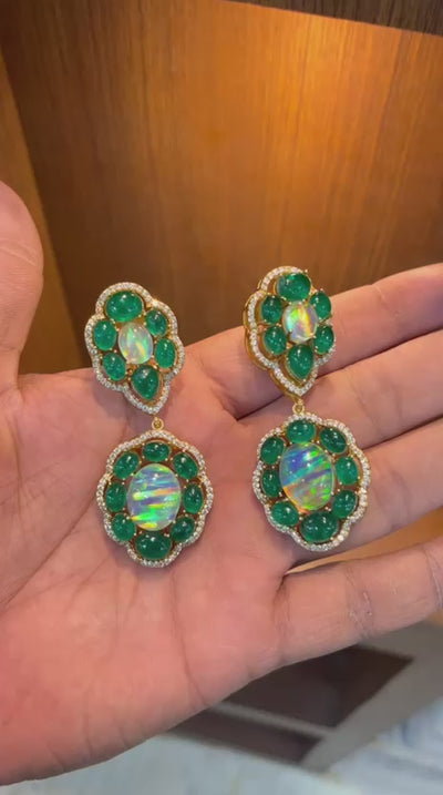 A luminous blend of colour and refined craftsmanship, these Emerald Opal Drop Earrings are designed to make an elegant statement. Featuring an iridescent opal like stone as centerpiece framed by rich emerald-green colored stones, the earrings are set in a delicate diamond-style halo that enhances their brilliance and depth.