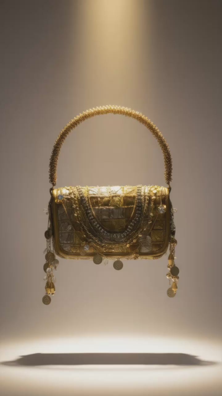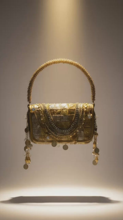 Step into the world of timeless luxury with the Deo Luxe Woven Flap Bag, a true statement piece for the modern woman. Handcrafted in radiant gota fabric with a textured finish, this bag is adorned with cascading strings, crystal embellishments, and antique coin charms. The structured silhouette is elevated by an ornate, embellished handle that makes it as much a jewel as it is a handbag.