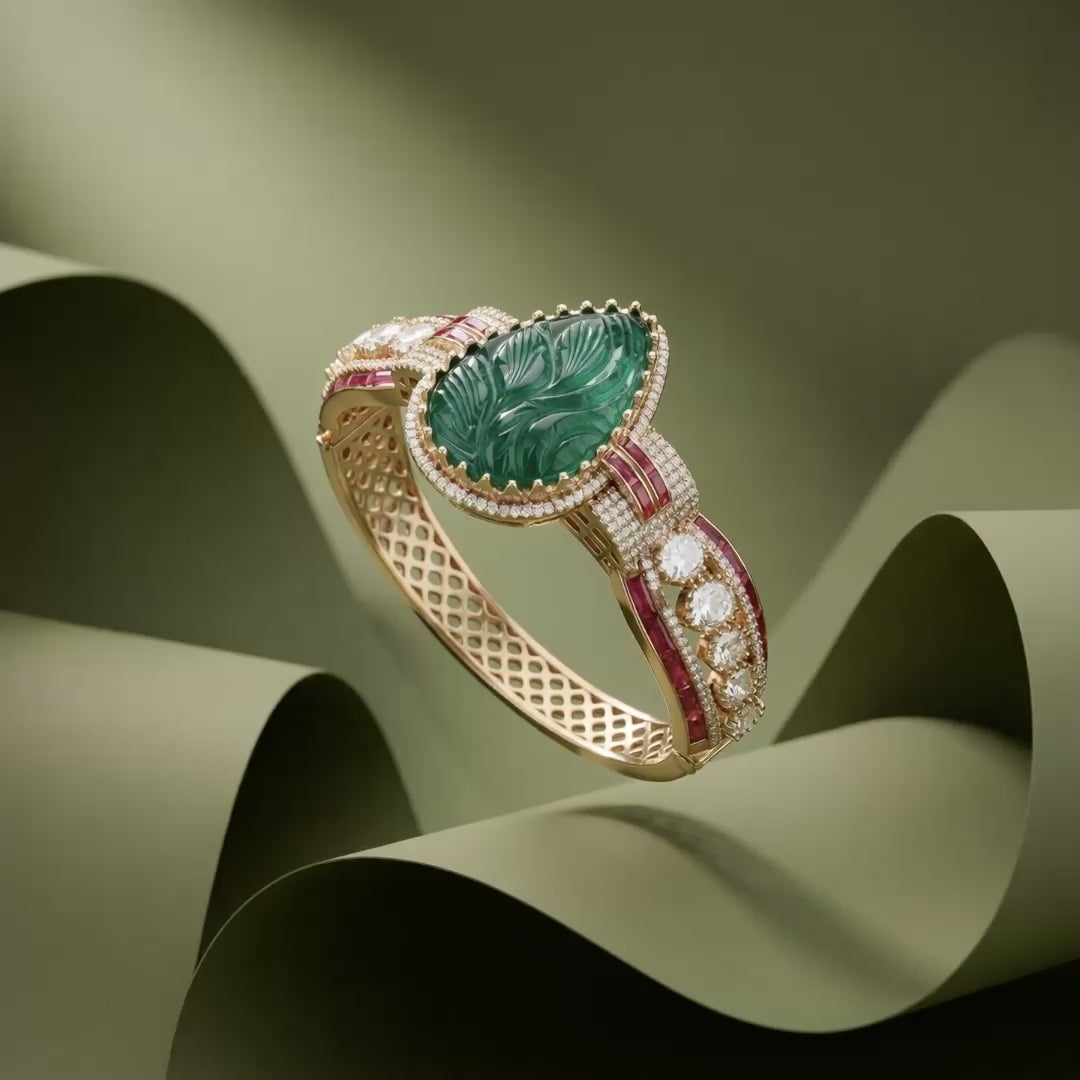 At the center sits a rich green oval stone, intricately hand-carved with a delicate leaf motif that adds depth and artisanal character. The carved centerpiece is framed with fine diamond-inspired detailing, enhancing its brilliance while preserving the beauty of the stone. The structured cuff band is adorned with ruby-toned accents and pear-shaped stones, set against a warm gold-tone base that lends the piece its regal presence.